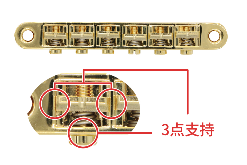 見た目は普通のチューンOマチックタイプに見えますが、よく見てみると、オクターブ調整用ネジの先端が側壁に達していません。これは弦をサドル両端とネジ頭の3点で支える独自構造で、サドルのガタつきを抑える効果があります。また、内臓スプリングはサドルを押さえることで不要な共振を防ぐ役目を果たしています。